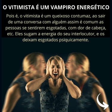 O vitimista também é um "vampiro energético", queixando-se constantemente e esgotando a energia de quem o ouve. Ele sente prazer em reclamar, pois isso atrai a piedade das pessoas, que é o seu objetivo maior. Mesmo que tudo pareça perfeito, ele encontra algo para reclamar e se ofender.