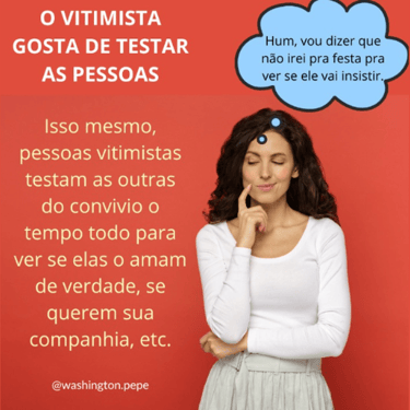Além disso, o vitimista é desconfiado, acreditando que sempre há alguém querendo enganá-lo. Ele é melindroso e instável, pronto para desistir de tudo. Qualquer brincadeira pode acionar gatilhos e fazê-lo se defender de um ataque imaginário. Ele testa as pessoas o tempo todo para ver se o amam de verdade, buscando a confirmação de que é rejeitado.
